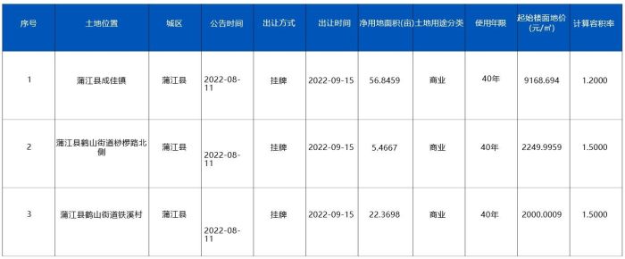蒲江縣第一宗供應(yīng)商業(yè)用地位于蒲江縣成佳鎮(zhèn),在2022年8月11日采取掛牌進(jìn)行告示,將于2022年9月15日出讓,土地被作為商業(yè)用地,使用年限40年,當(dāng)前起始樓面地價(jià)為9168.694㎡,土地項(xiàng)目?jī)粲玫孛娣e為56.8459畝。